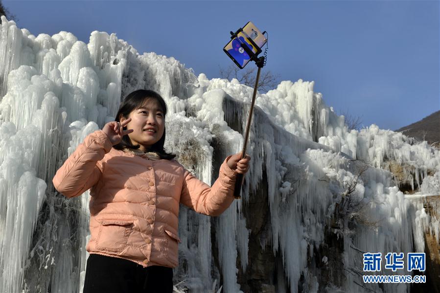 1月20日,游客在河北省沙河市大安山冰瀑景观前自拍。近日,河北省沙河市大安山出现冰瀑景观,吸引了众多游客前来观赏游玩。新华社记者 牟宇 摄