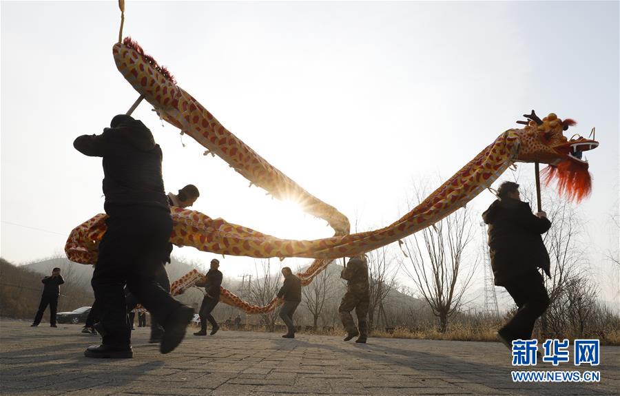 春节临近,河北唐山遵化市小厂乡洪山口村的场院里一片热闹景象,民间艺人们正在抓紧排练舞龙、旱船、太平车、赶驴、秧歌等传统民俗表演节目,为新春佳节演出做准备。