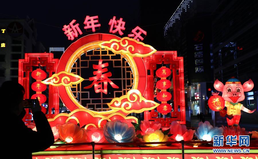 1月25日,市民在江苏苏州石路步行街上的“福猪迎春”彩灯前拍照。随着春节临近,春联、福字和红灯笼扮靓了大街小巷。新华社发(杭兴微 摄)
