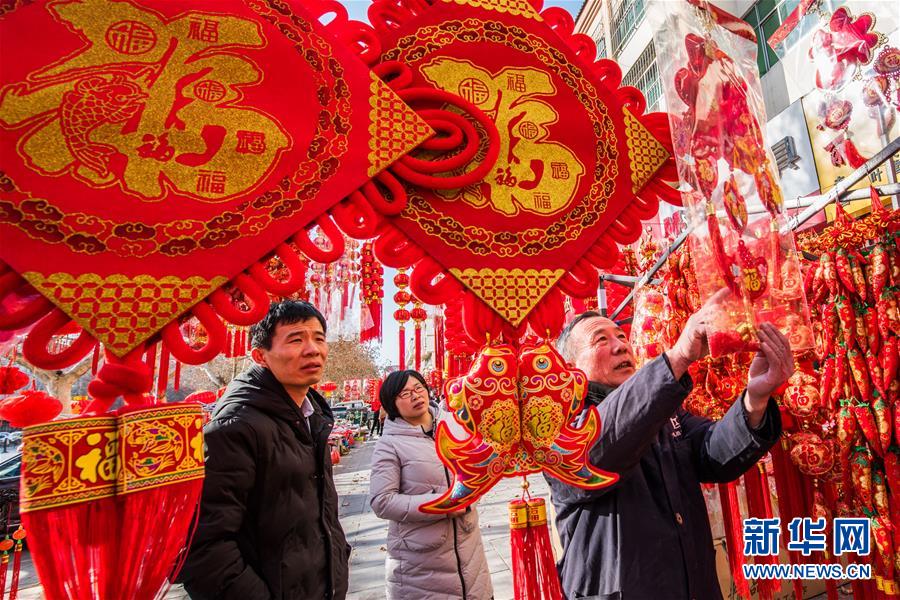 1月25日,市民在山东潍坊青州市一年货市场选购饰品。随着春节临近,春联、福字和红灯笼扮靓了大街小巷。新华社发(王继林 摄)
