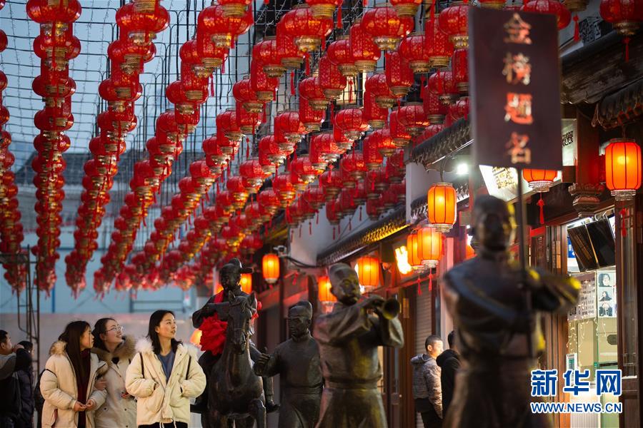 1月25日,游人在江苏南京夫子庙景区游玩。随着春节临近,春联、福字和红灯笼扮靓了大街小巷。新华社发(苏阳 摄)