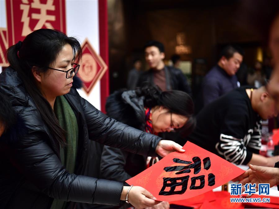 1月26日,一名书法家在活动现场为市民送“福”字。新华社发(张龙 摄)