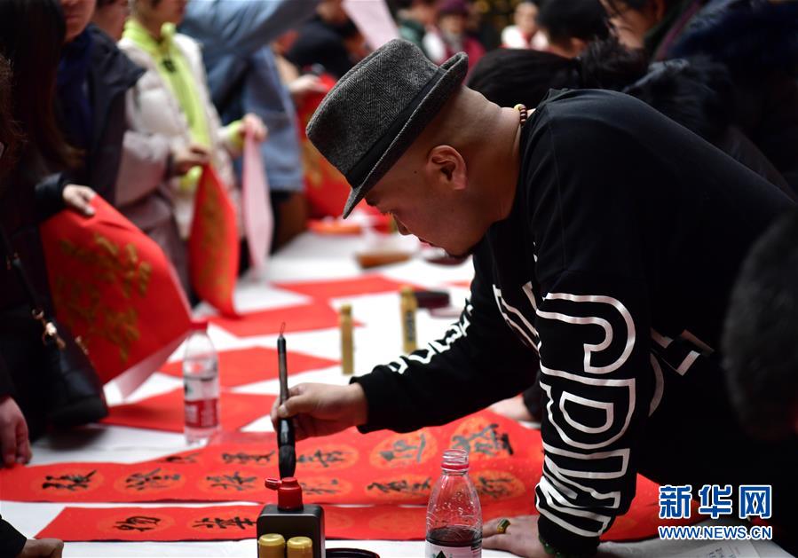 1月26日,一名书法家在活动现场写春联。新华社发(张龙 摄)
