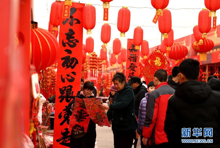 1月27日,人们在石家庄市正定县年货大集上购买春联。春节临近,各地的集市、市场年味浓浓,处处洋溢着喜迎新春佳节的气氛。新华社发(陈其保 摄)