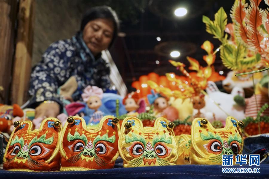 1月26日,一名摊主在河北省唐山市美食文化街的摊位上摆放传统手工艺品。春节临近,各地的集市、市场年味浓浓,处处洋溢着喜迎新春佳节的气氛。新华社发(刘满仓 摄)
