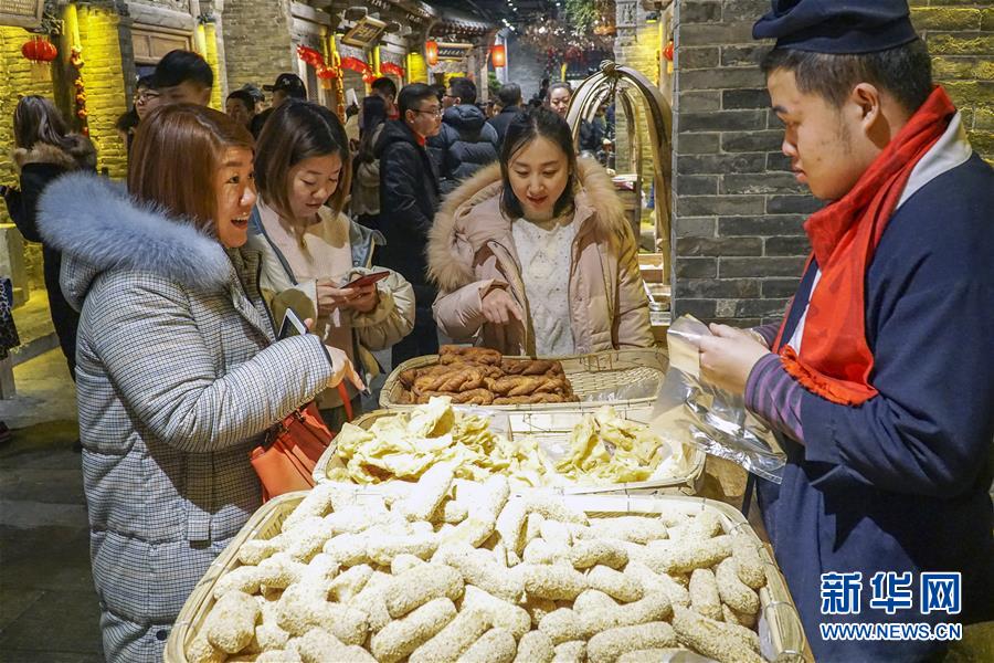 1月26日,市民在河北省唐山市美食文化街购买地方传统小吃。春节临近,各地的集市、市场年味浓浓,处处洋溢着喜迎新春佳节的气氛。新华社发(刘满仓 摄)