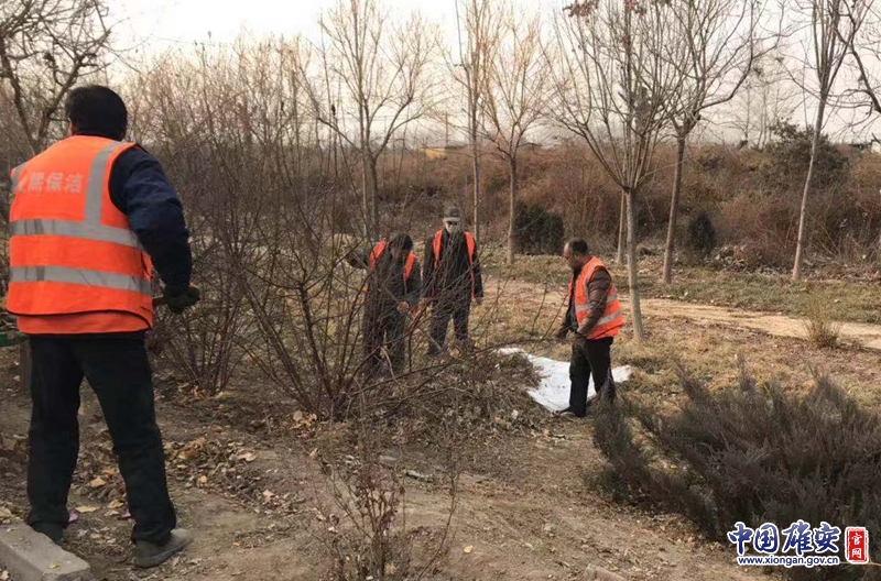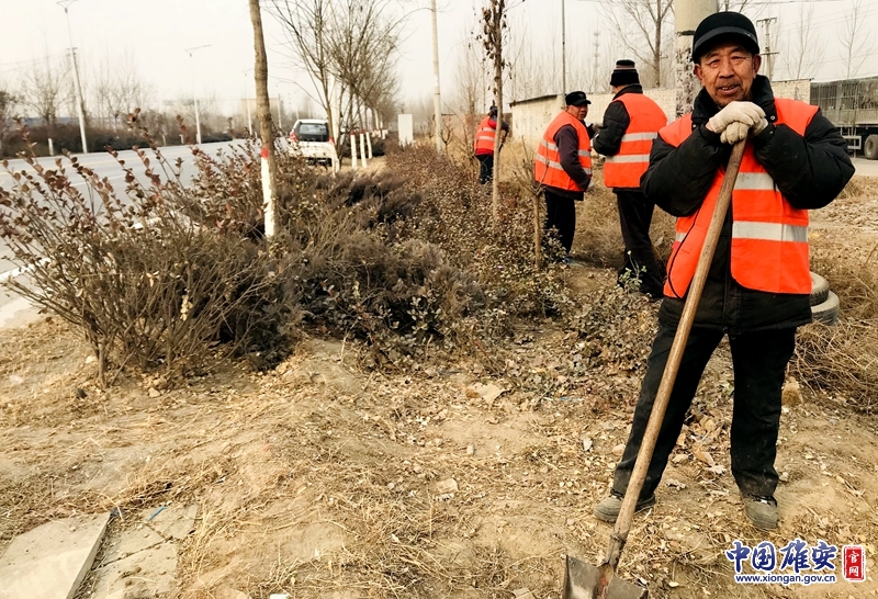 1月29日,环卫工人在容城县豪丹路两侧绿化带清理杂草。中国雄安官网记者李晏 摄