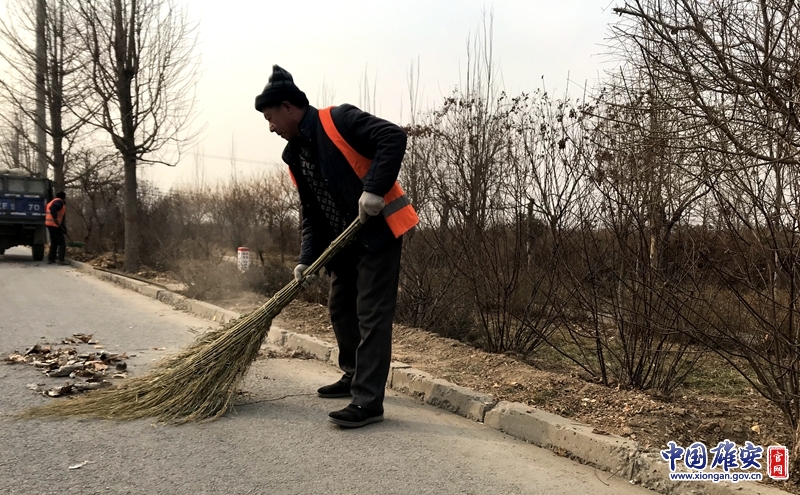 1月29日,环卫工人集中清理容城县大水大街绿化带及两侧边沟垃圾。中国雄安官网记者李晏 摄