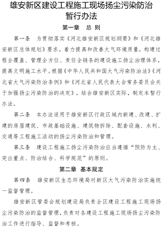 该办法落实《河北雄安新区规划纲要》和《河北雄安新区总体规划》要求,着力提高和改善大气环境质量,构建过程全覆盖、管理全方位、责任全链条的建设施工扬尘治理体系,提高文明施工水平。