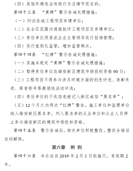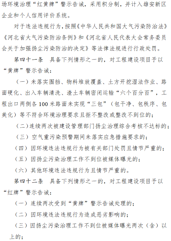 根据《办法》,在技术手段上,对施工现场全覆盖和红外监控,24小时采集PM2.5、PM10数据;在节能环保方面,提倡使用新型生态、节能、环保产品,宜优先选用成套装配式产品,必须使用具有定位功能的全封闭环保型新能源专用运输车辆,必须使用符合国家及地方排放标准或电动等新能源的非道路移动机械;实行建设工程施工现场环境治理“红黄牌”警示告诫,采用积分制,并计入雄安新区企业和个人信用评价系统;在处罚力度上,12个月之内两次“红牌”警告的,施工单位和监理单位纳入雄安新区黑名单,列入黑名单的从业单位和从业人员停止参与雄安新区的建筑市场投标资格。