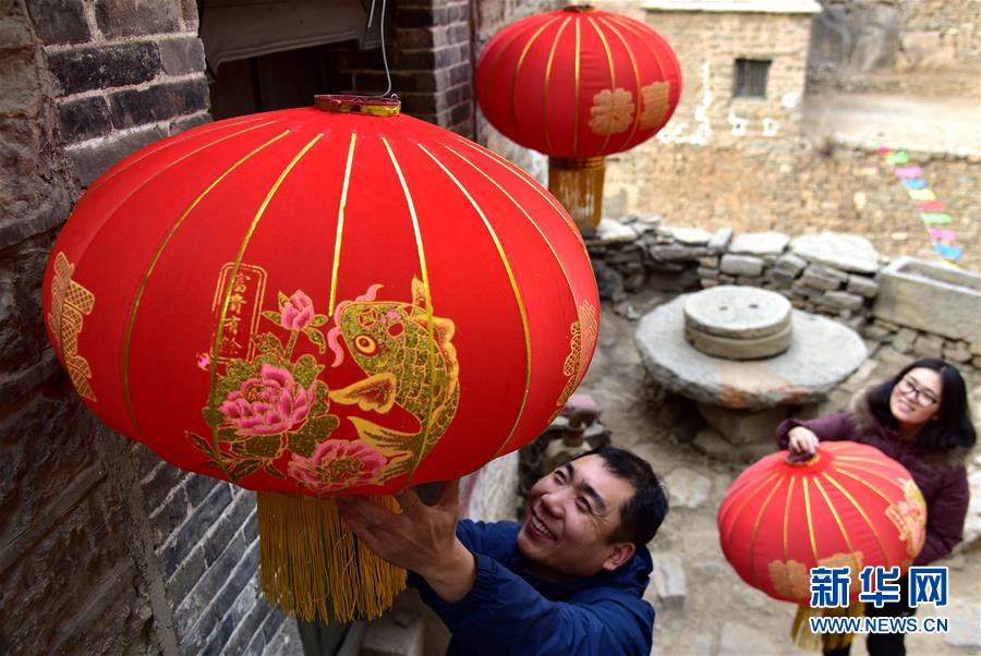 1月30日,涉县更乐镇大洼村村民在挂灯笼。春节临近,在河北涉县一些乡村,人们贴窗花、挂灯笼,迎接佳节。新华社记者 王晓 摄