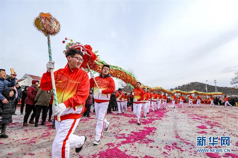 1月31日,人们在山东省荣成市俚岛镇2019年迎新春活动上舞龙。