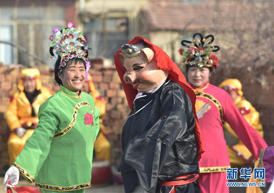 1月31日,山东省邹平市临池镇西高村农民文艺队为村民演出自编山村舞蹈《三妹戏八戒》。新华社发(董乃德 摄)