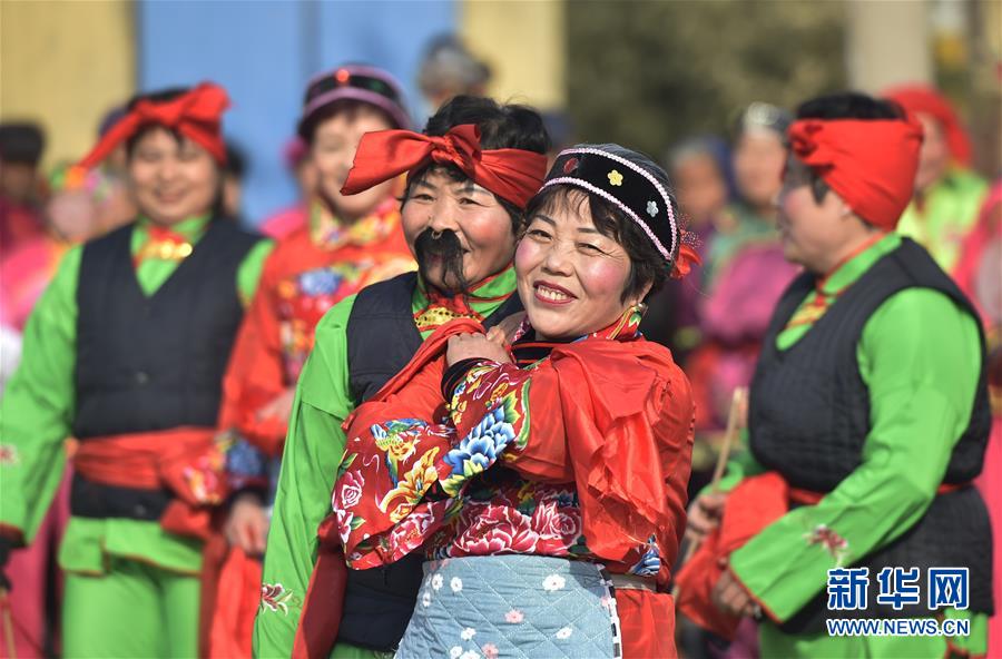 1月31日,山东省邹平市临池镇西高村农民文艺队为村民演出自编山村舞蹈《迎新春》。新华社发(董乃德 摄)