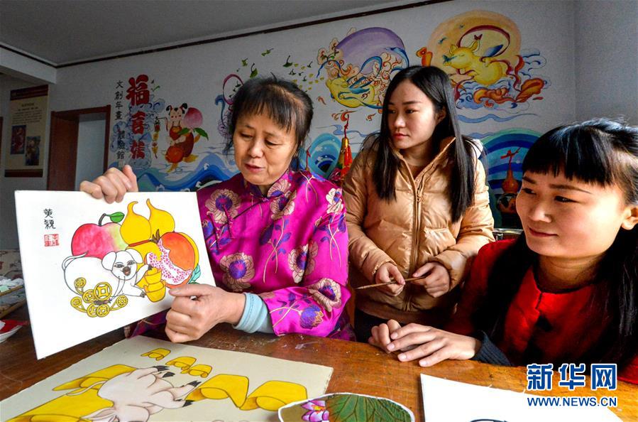 2月2日,黄颖(左)在她的工作室指导学生手绘年画的绘画技法。