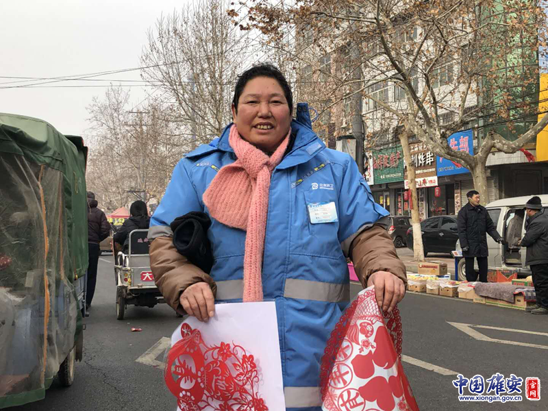 2月3日,环卫工人仁传兰在雄县年货一条街买了两张福字窗花,准备下班后贴在家中。李健 摄