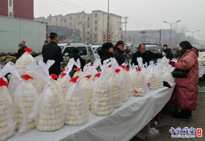 2月3日,安新县安新镇的早市一条街上,一袋袋花糕整齐地摆放在桌上供大家选购。李振海 摄
