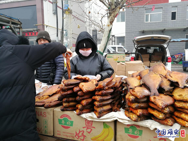 2月3日,安新县安新镇的早市上,市民正在挑选当地的特色熏鱼。李振海 摄