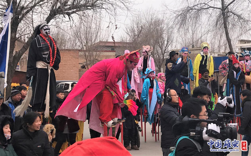 “我也瞅瞅。”雄安新区赵北口镇,一位高跷表演者俯身观看拍摄者取景。中共赵北口镇党委、赵北口镇人民政府供图
