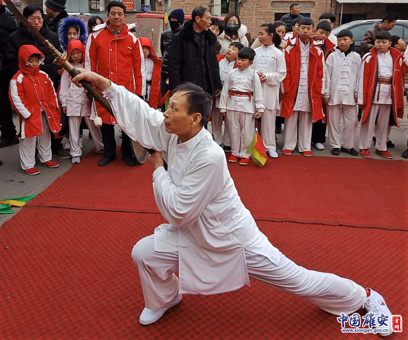雄安新区赵北口镇,少林老会前辈在众多小学员面前表演少林武术。中共赵北口镇党委、赵北口镇人民政府供图