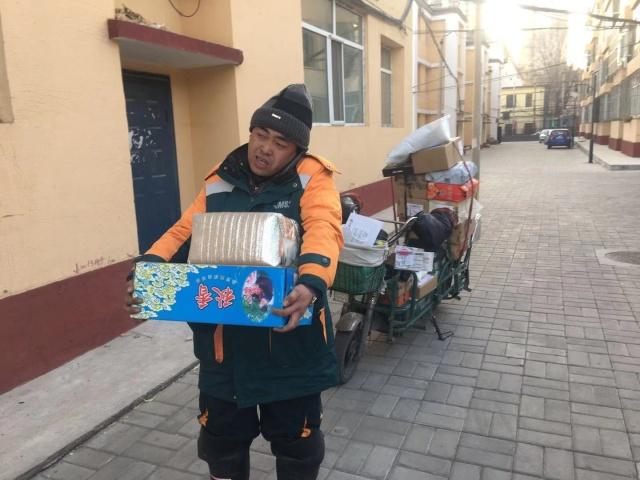 陈雷在小区里一边送件一边接听电话。新华社记者王浩程摄