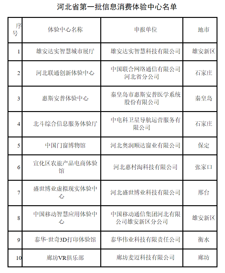 根据《河北省“大智移云”发展领导小组办公室关于组织申报河北省第一批信息消费体验中心的通知》(冀大智移云办〔2018〕4号)要求,此次认定的10个信息消费体验中心将通过展示展览、体验互动等,引领消费、促进消费、带动消费,推动创新创业、产业转型,促进消费升级和改善民生等。
