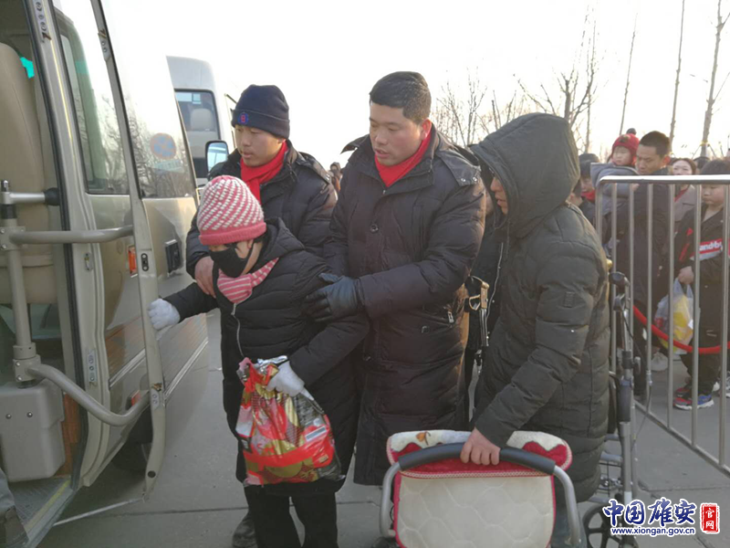 雄安市民服务中心工作人员搀扶老人上车,春节假期他们坚守在岗,为有需要的游客提供帮助。中国雄安官网记者孙丹 摄