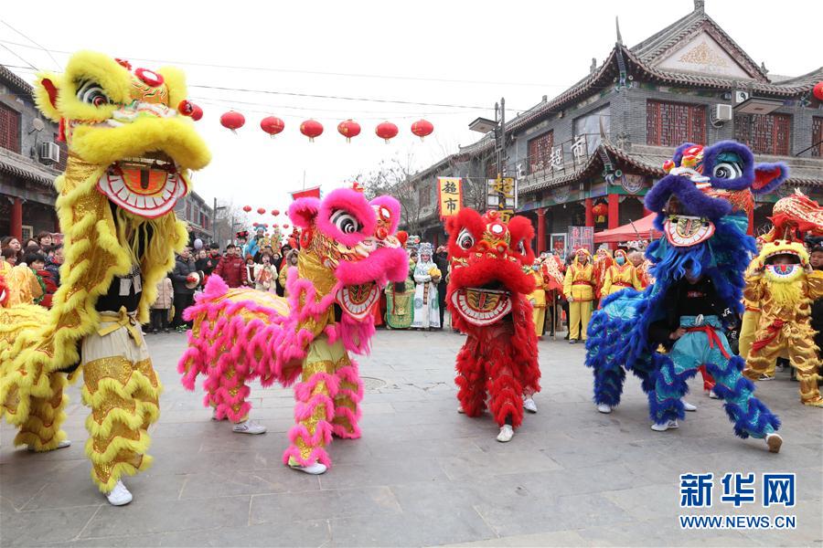 2月10日,民间艺人在河北邯郸市广府古城庙会上表演舞狮。当日是春节长假最后一天,各地举行的假日活动丰富多彩。新华社发(杨扬 摄)