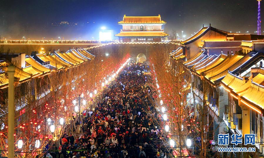 2月9日,游客在石家庄市正定古城夜游。 春节期间,河北石家庄正定古城吸引各地游客前来观光游览,感受浓浓的年味儿。近年来,石家庄正定县通过恢复古城风貌、提升产业水平以及实施文化资源与旅游资源整合的方式,打造古城文化品牌,使旅游产业成为该县支柱型产业。新华社发(张海强 摄)