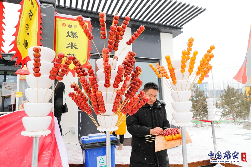 2019雄安新区嘉年华,中外美食乐享区,工作人员准备将已定型的糖葫芦插在桩子上。中国雄安官网记者毛鹤然 摄