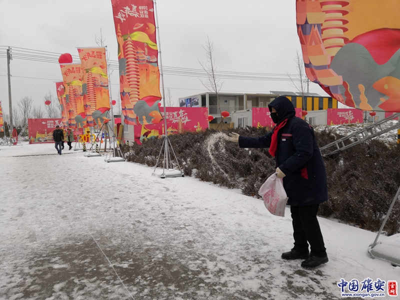 工作人员在嘉年华活动入口处撒融雪剂,防止路面结冰,确保游客出行安全。中国雄安官网记者朱伟琳 摄