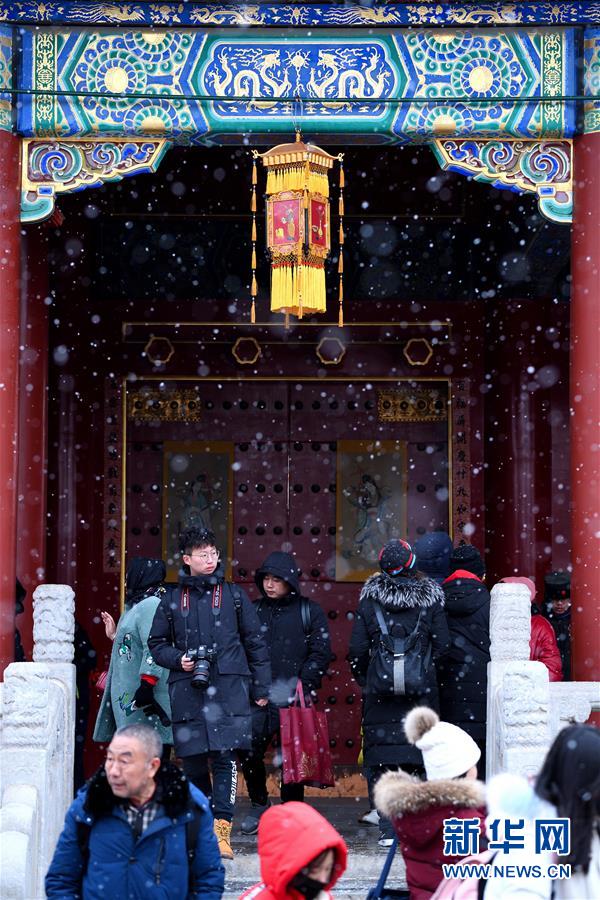 2月12日,游客在北京故宫游览。当日,北京降雪,大批游人来到故宫游览赏雪。新华社发(王琎 摄)