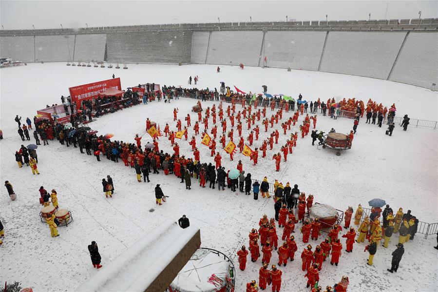 2月14日,在石家庄市正定古城翁城内,战鼓表演者在表演。当日,来自河北省石家庄市的12支战鼓队齐聚石家庄正定古城瓮城内,用战鼓表演的方式喜迎新春,给游客带来一场精彩绝伦的鼓乐盛宴。新华社发(梁子栋 摄)