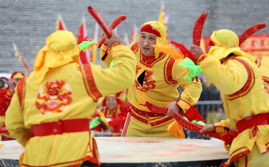 2月14日,在石家庄市正定古城翁城内,战鼓表演者在表演。当日,来自河北省石家庄市的12支战鼓队齐聚石家庄正定古城瓮城内,用战鼓表演的方式喜迎新春,给游客带来一场精彩绝伦的鼓乐盛宴。新华社发(梁子栋 摄)