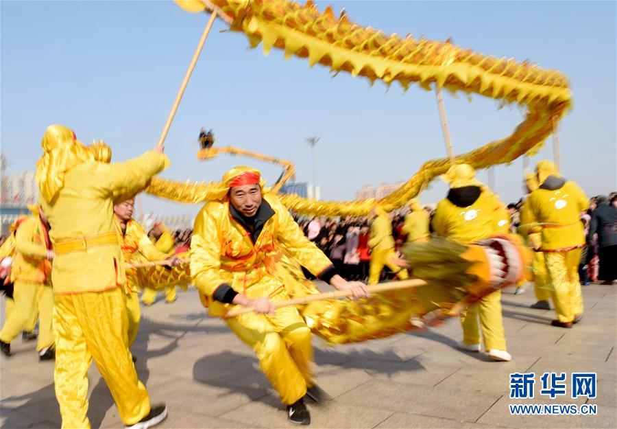 2月16日,邢台市威县民间艺人在表演舞龙。元宵节将至,河北省邢台市威县举行民俗展演活动,当地民间艺人表演舞龙、舞狮、威县乱弹等民俗节目,热热闹闹迎元宵。新华社发(邱洪生 摄)