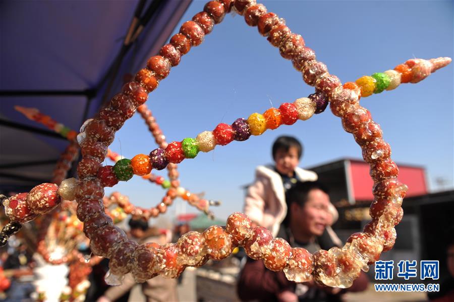 2月17日,游客在后李花村“糖墩儿节”上游览。当日,河北省任丘市吕公堡镇后李花村一年一度的“糖墩儿节”开幕,上百位制作糖墩儿的师傅用山楂、山药、菠萝等食材制成样式各异的糖墩儿,吸引众多游客前来赏民俗、闹元宵。新华社记者 牟宇 摄