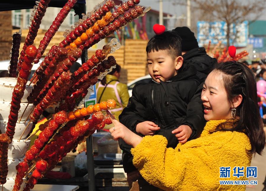 2月17日,游客在后李花村“糖墩儿节”上选购糖墩儿。当日,河北省任丘市吕公堡镇后李花村一年一度的“糖墩儿节”开幕,上百位制作糖墩儿的师傅用山楂、山药、菠萝等食材制成样式各异的糖墩儿,吸引众多游客前来赏民俗、闹元宵。新华社记者 牟宇 摄