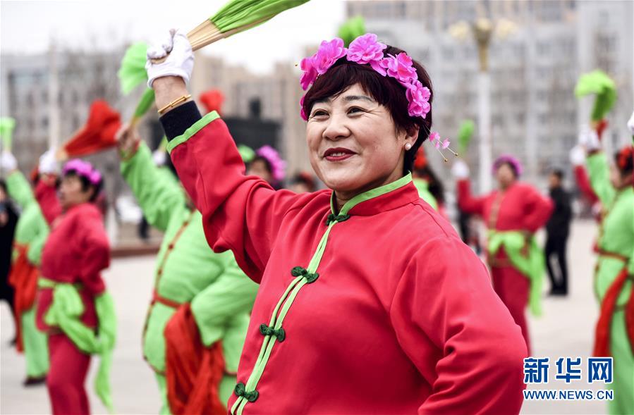 这是河北省阜城县花会展演上的秧歌表演(2月18日摄)。 2月18日,河北省阜城县元宵花会展演拉开帷幕,秧歌、舞龙、舞狮等展演节目增添了节日的喜庆气氛,给全县人民送上“文化大餐”。新华社记者李晓果摄