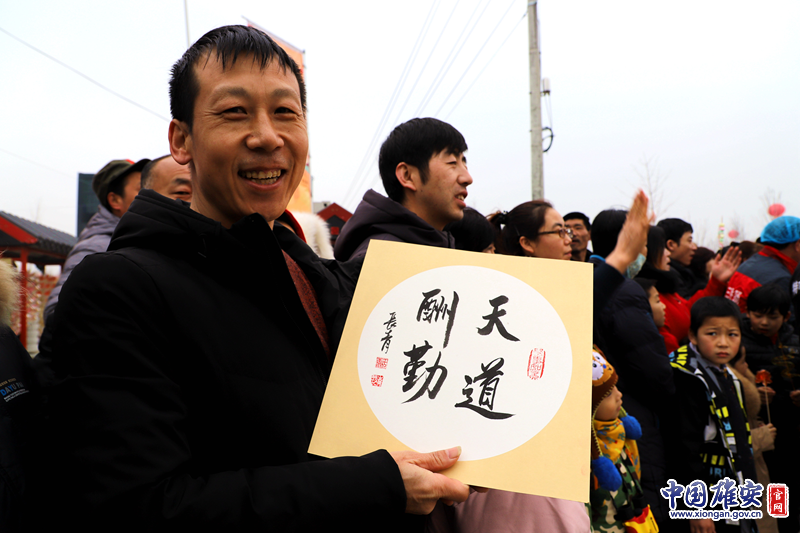 正月十五,2019雄安新区嘉年华活动上,一位游客在答题游戏中赢得书法作品。中国雄安官网石萍婷 摄