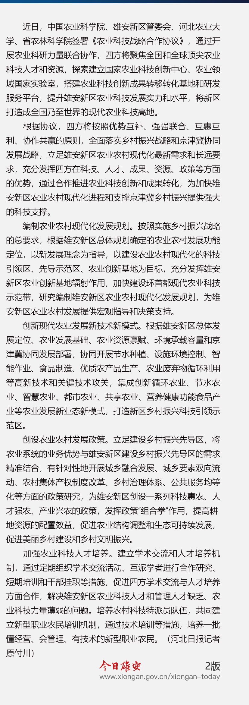 近日,中国农业科学院、雄安新区管委会、河北农业大学、省农林科学院签署《农业科技战略合作协议》。