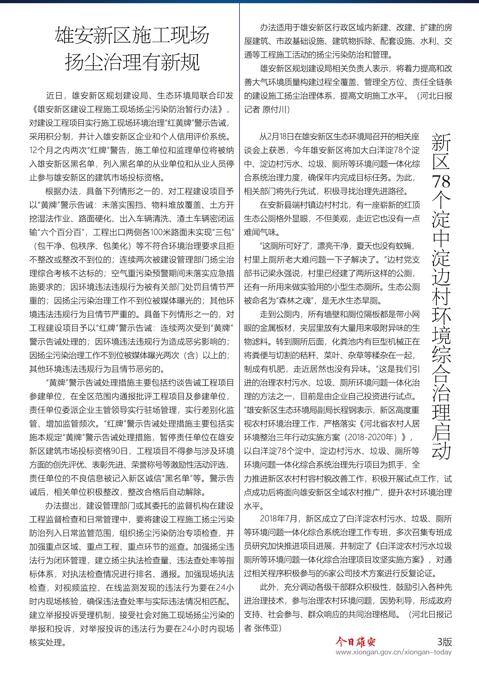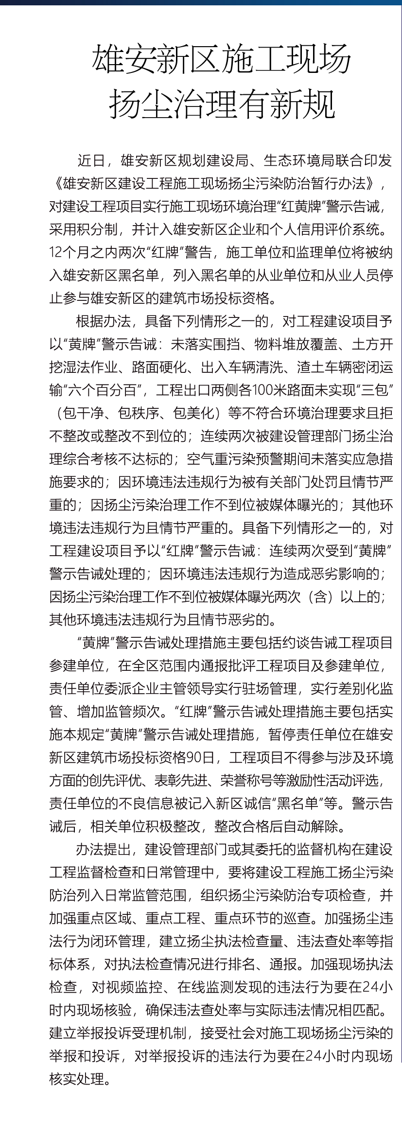 近日,雄安新区规划建设局、生态环境局联合印发《雄安新区建设工程施工现场扬尘污染防治暂行办法》。