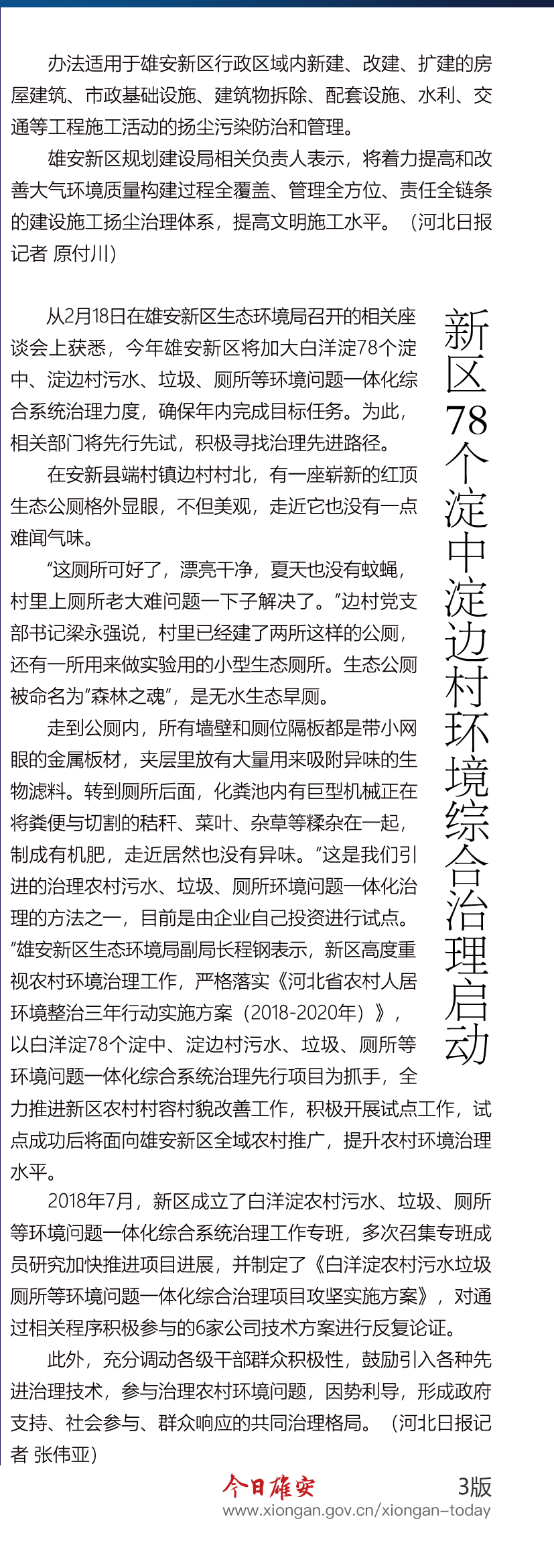 今年雄安新区将加大白洋淀78个淀中、淀边村污水、垃圾、厕所等环境问题一体化综合系统治理力度,确保年内完成目标任务。