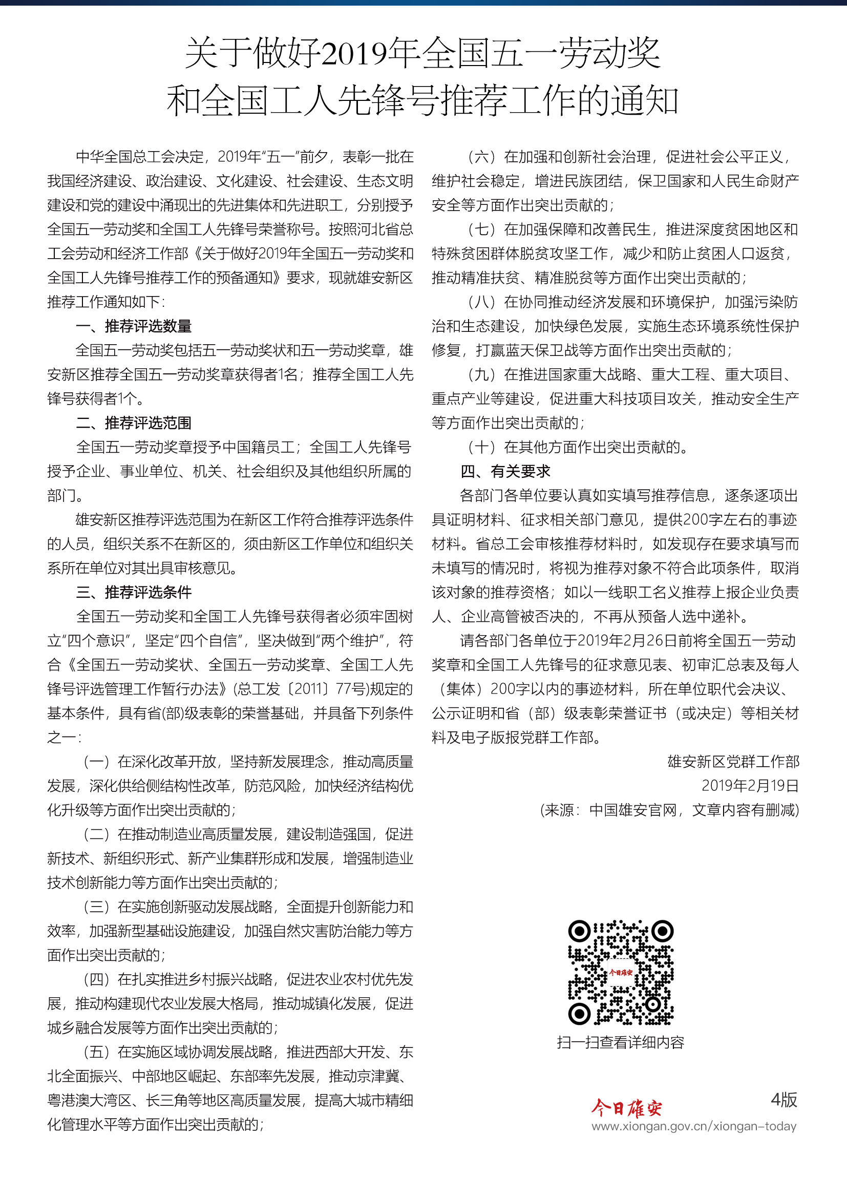 按照河北省总工会劳动和经济工作部《关于做好2019年全国五一劳动奖和全国工人先锋号推荐工作的预备通知》要求,雄安新区发布推荐工作通知。