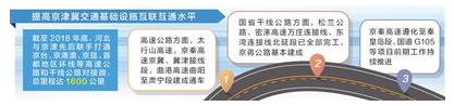 提高京津冀交通基础设施互联互通水平。截至2018年底,河北与京津先后联手打通京台、京港澳、京昆、首都地区环线等高速公路和干线公路对接路,总里程达1600公里。高速公路方面,太行山高速,京秦高速京冀、冀津接线段,曲港高速曲阳至肃宁段建成通车;国省干线公路方面,松兰公路、密涿高速万庄连接线、东湾连接线北延段已全部完工,京蒋公路基本建成。京秦高速遵化至秦皇岛段、国道G105等项目前期工作持续推进。