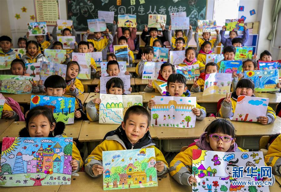2月21日,河北省大厂回族自治县城区二小一年级四班的孩子们在展示自己绘制的家乡美景。连日来,河北省多所中小学迎来春季开学。大厂回族自治县城区二小开展了以“画出我们最爱的家乡”为主题的“开学第一课”活动,孩子们在老师的指导下把对家乡的热爱倾注在手中的五彩画笔中,描绘出心中最美的家乡风景,抒发对祖国、对家乡的无限热爱。新华社记者李晓果摄
