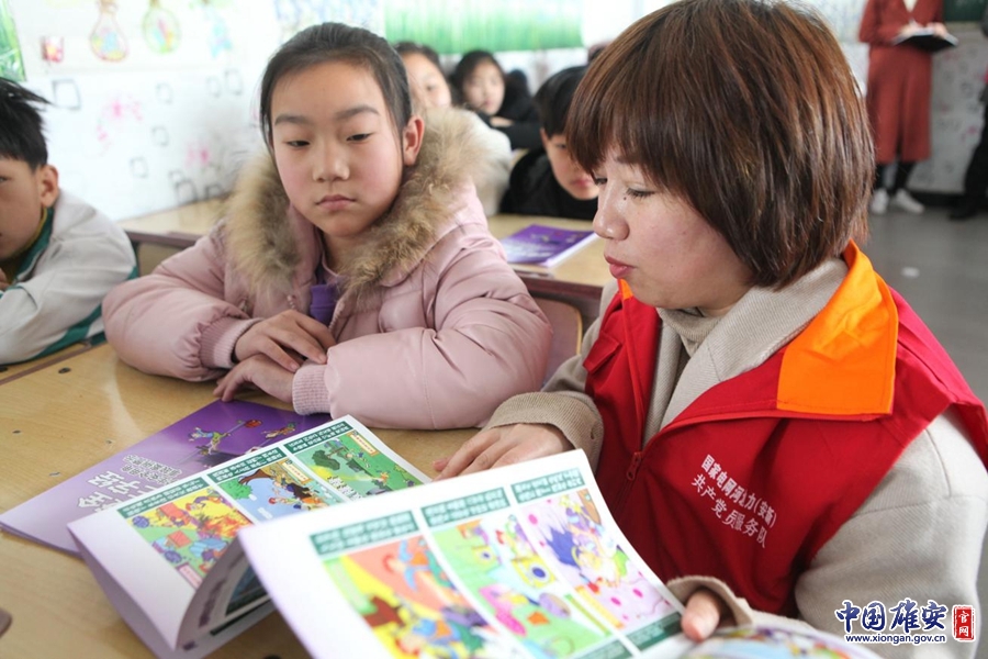 国网雄安新区供电公司共产党员服务队队员为学生发放《用电安全三字经》宣传彩页。李亚琨 摄