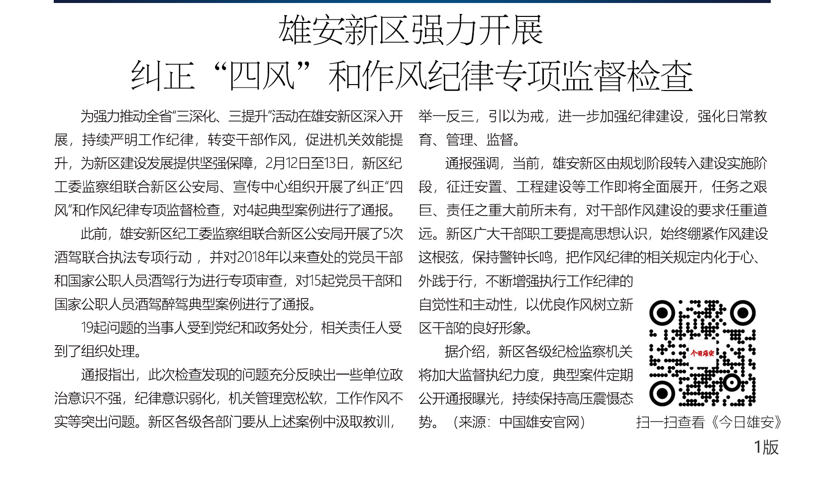 2月12日至13日,雄安新区纪工委监察组联合新区公安局、宣传中心组织开展了纠正“四风”和作风纪律专项监督检查,对4起典型案例进行了通报。