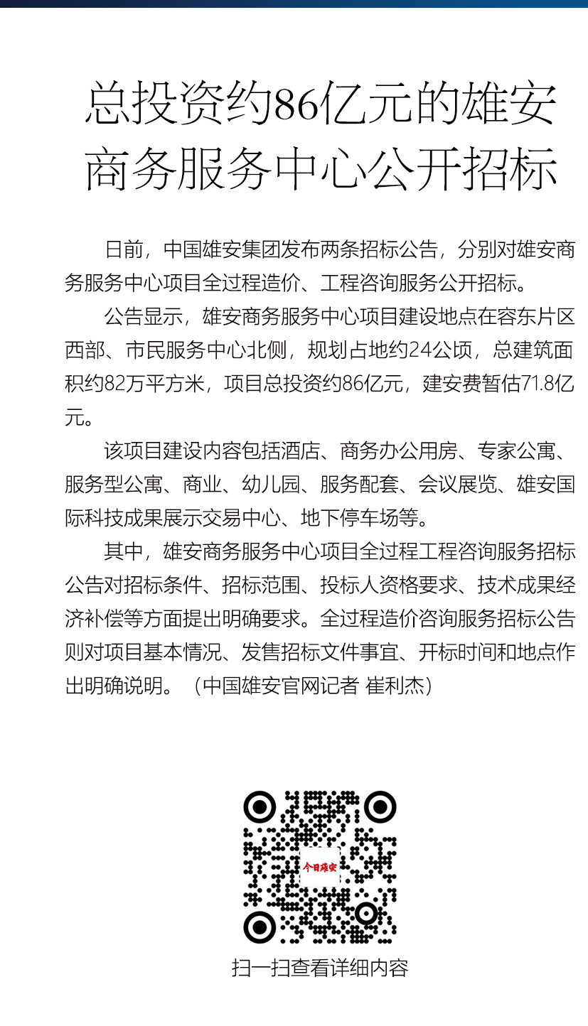 日前,中国雄安集团发布两条招标公告,分别对雄安商务服务中心项目全过程造价、工程咨询服务公开招标。