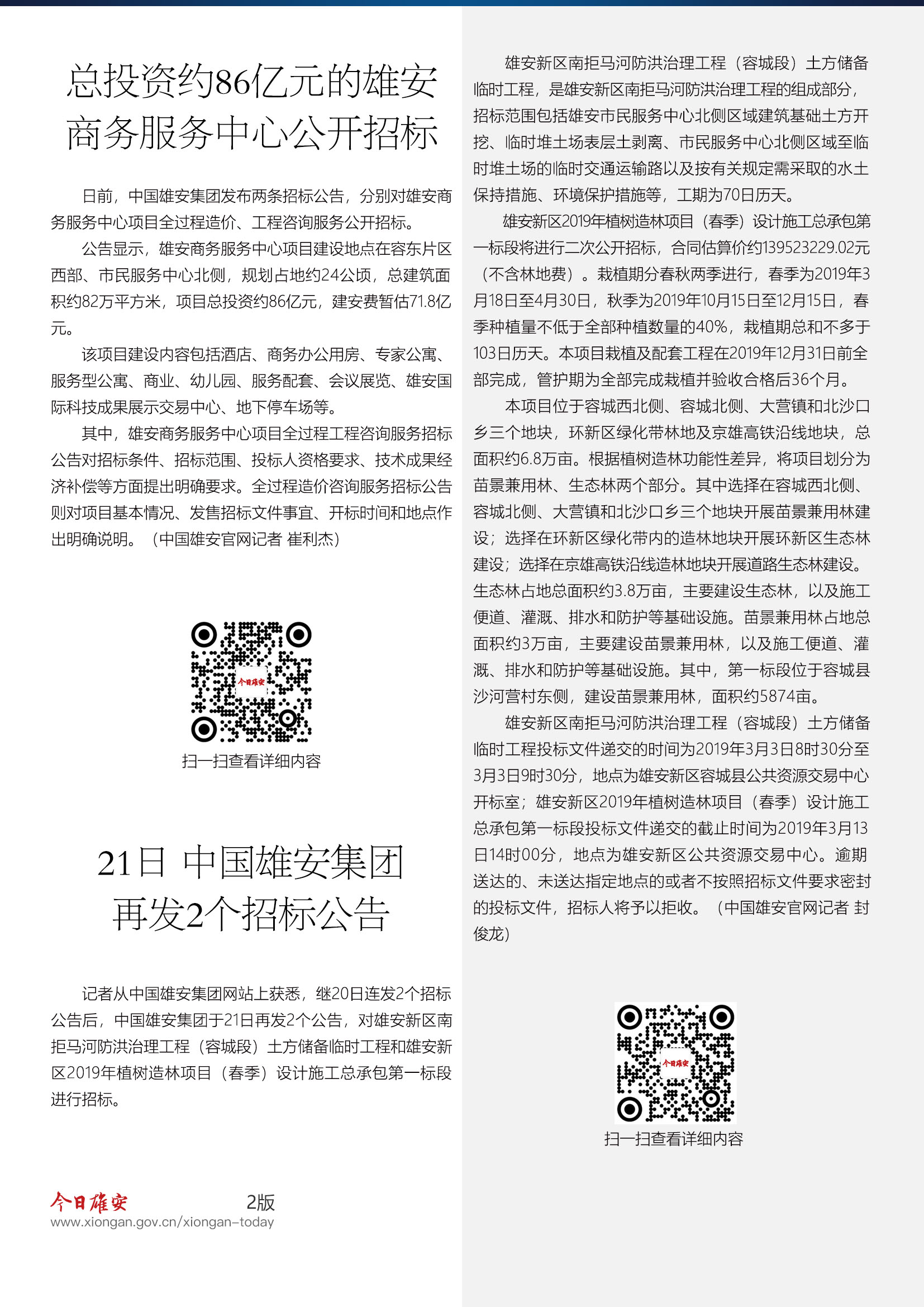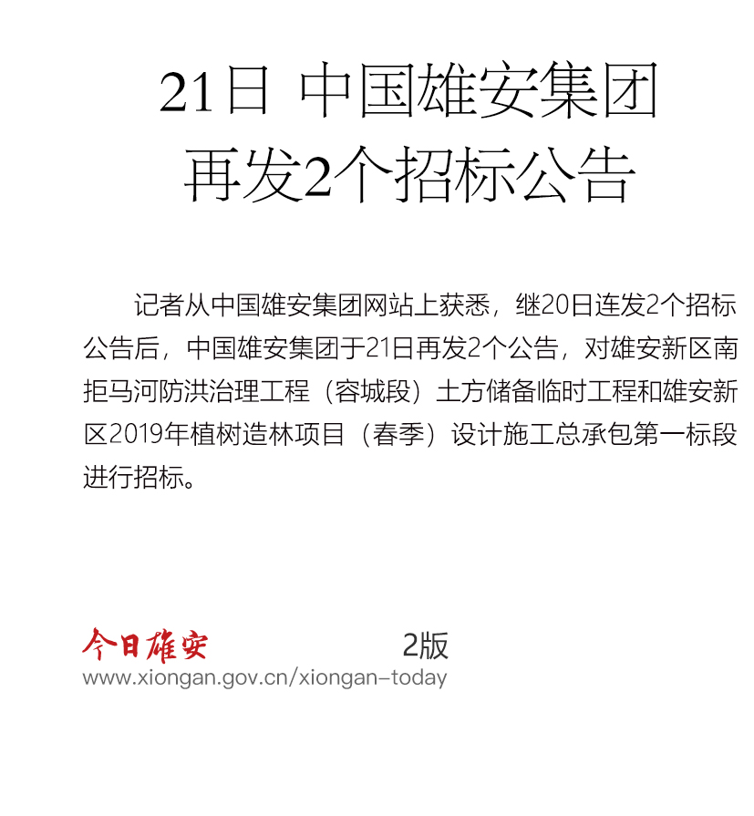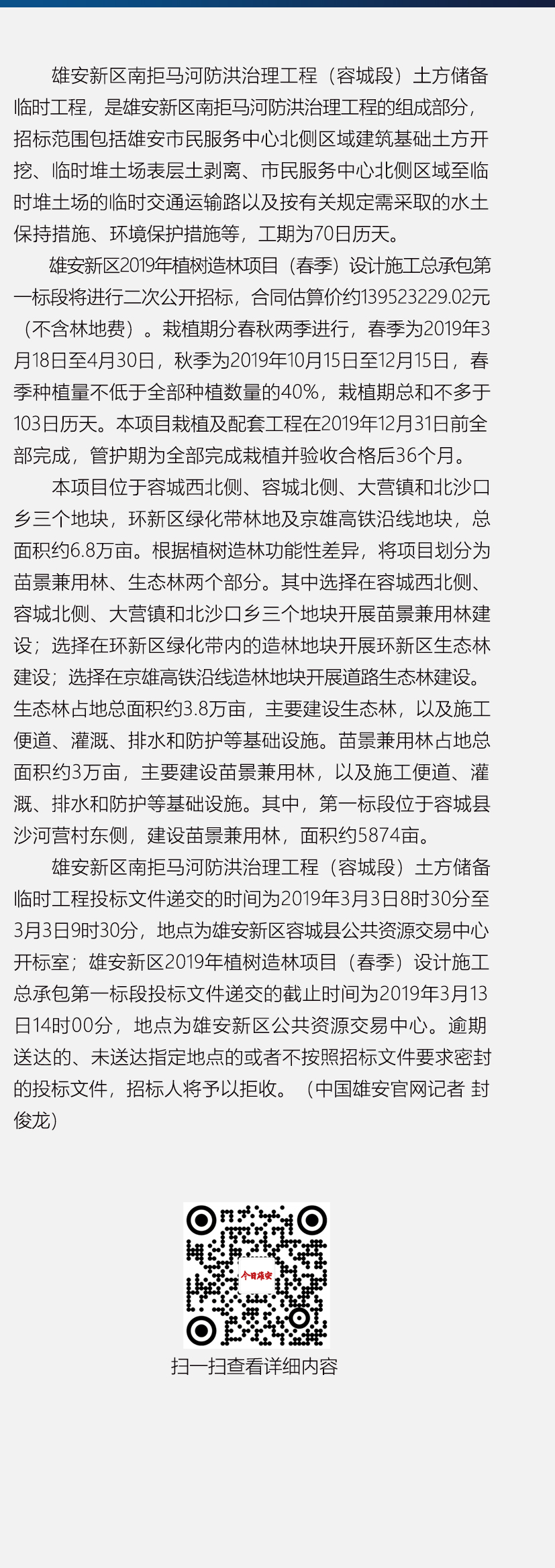 中国雄安集团对雄安新区南拒马河防洪治理工程(容城段)土方储备临时工程和雄安新区2019年植树造林项目(春季)设计施工总承包第一标段进行招标。