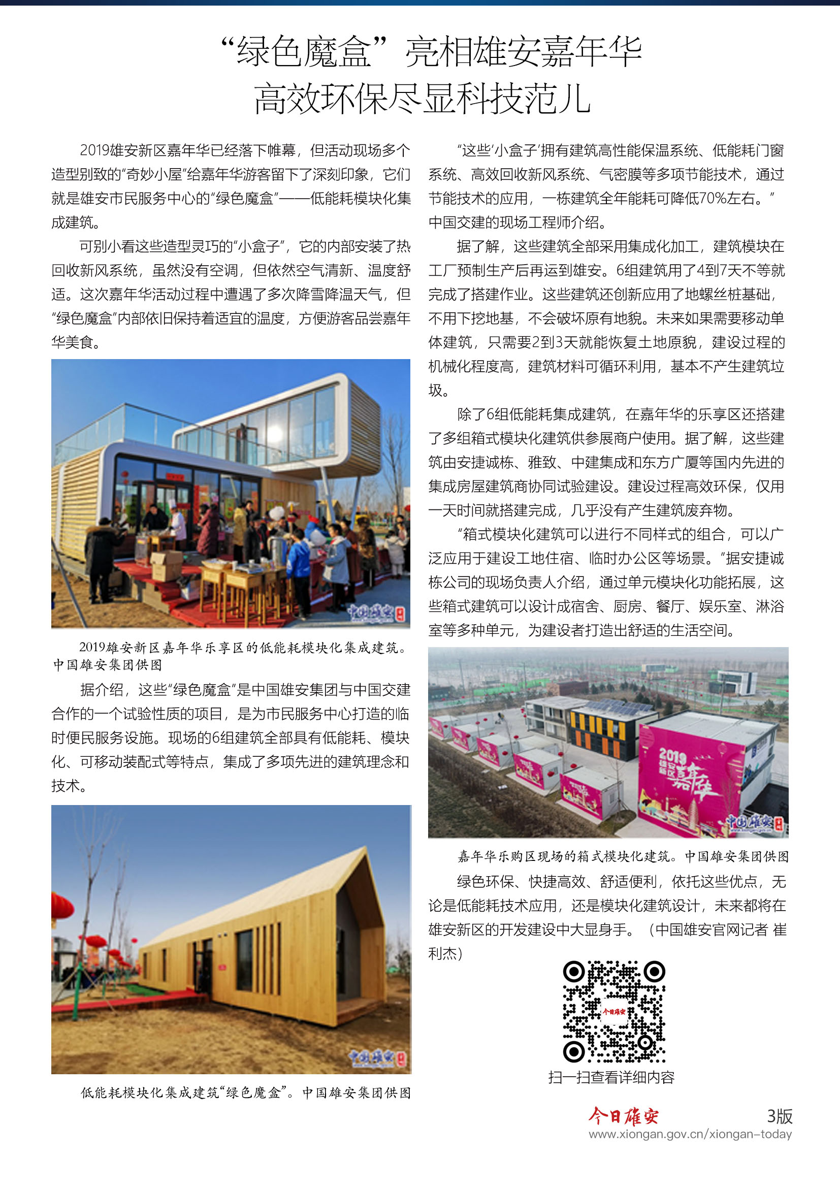 2019雄安新区嘉年华已经落下帷幕,但活动现场多个造型别致的“奇妙小屋”给嘉年华游客留下了深刻印象,它们就是雄安市民服务中心的“绿色魔盒”——低能耗模块化集成建筑。